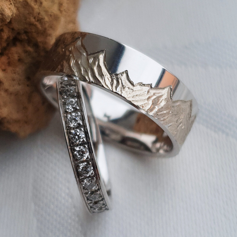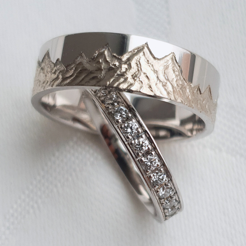 Mehe abielusõrmusele graveerisime käsitööna kliendi soovil mäestiku. Naise sõrmus sai üle puistatud teemantide säraga.